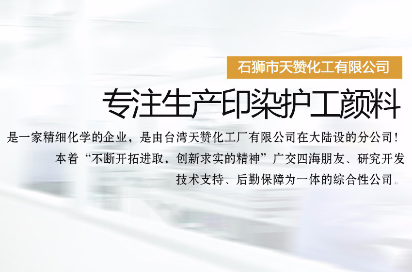 石獅市天贊化工有限公司是一家生產印染護工顏料的公司,是一家精細化學的企業,是由臺灣天贊化工廠有限公司。在大陸設的分公司!本著“不斷開拓進取,創新求實的精神”廣交四海朋友、研究開發、技術支持、后勤保障為一體的綜合性公司。二十年來,我們對紡織,前處理,后整理,技術的研究實踐中體會得經驗。